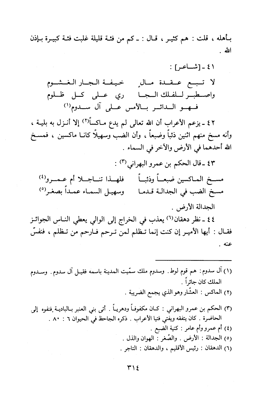 فهو الدائر بالأمس على آل سدوم «1» 42- يزعم الأعراب أن الله تعالى لم يدع ماكسا «2» إلا أنزل به بلية، وأنه مسخ منهم اثنين ذئبا وضبعا، وأن الضب وسهيلا كانا ماكسين، فمسخ الله أحدهما في الأرض والآخر في السماء.