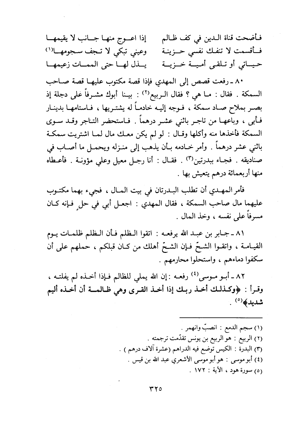 80- رفعت قصص إلى المهدي فإذا قصة مكتوب عليها قصة صاحب السمكة. فقال: ما هي؟ فقال الربيع «2» : بينا أبوك مشرفا على دجلة إذ بصر بملاح صاد سمكة، فوجه إليه خادما له يشتريها، فاستامها بدينار فأبى، وباعها من تاجر باثني عشر درهما. فاستحضر التاجر وقد سوى السمكة فأخذها منه وأكلها وقال: لو لم يكن معك مال لما اشتريت سمكة باثني عشر درهما. وأمر خادمه بأن يذهب إلى منزله ويحمل ما أصاب في صناديقه. فجاء ببدرتين «3» . فقال: أنا رجل معيل وعلي مؤونة. فأعطاه منها أربعمائة درهم يتعيش بها.