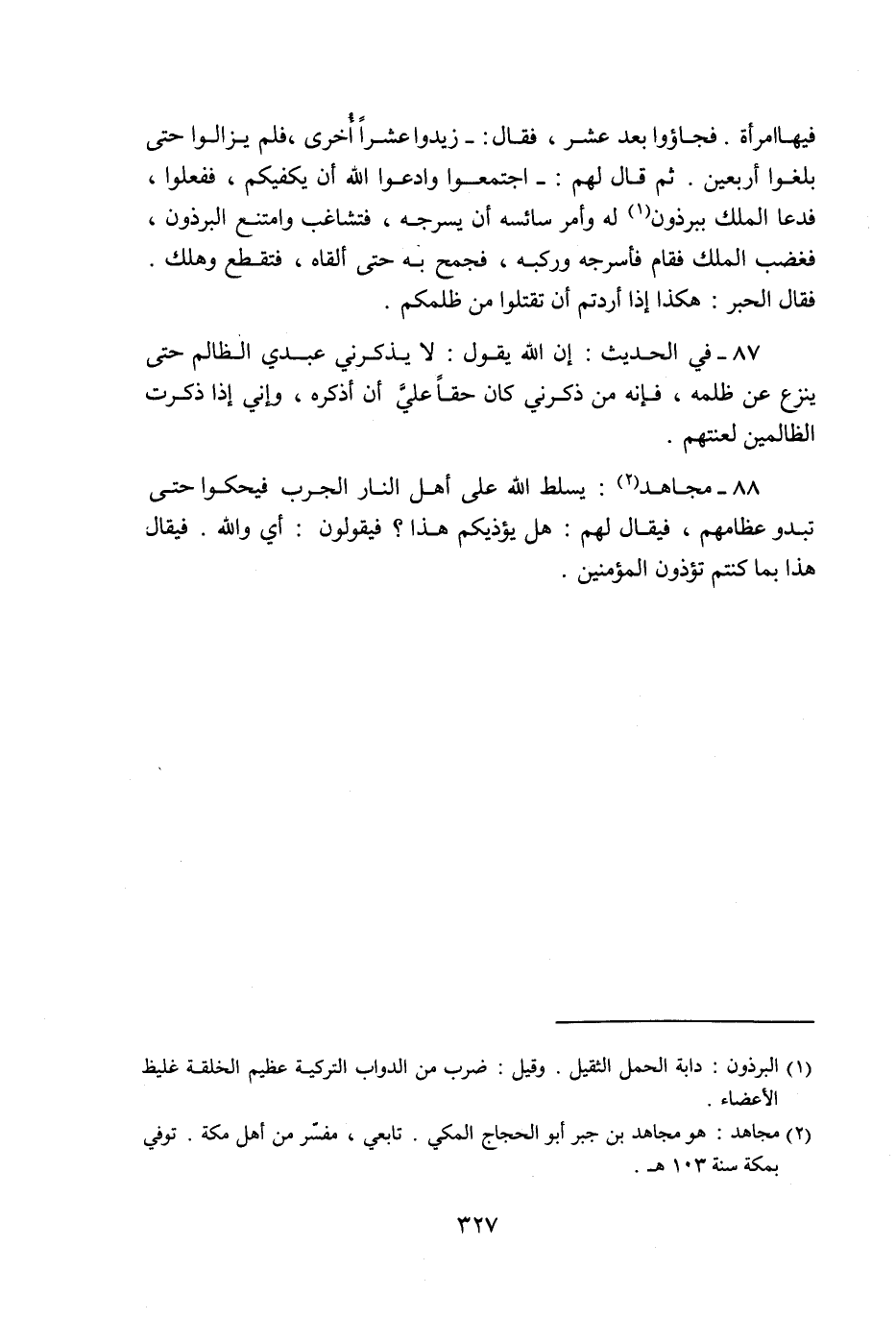88- مجاهد «2» : يسلط الله على أهل النار الجرب فيحكوا حتى تبدو عظامهم، فيقال لهم: هل يؤذيكم هذا؟ فيقولون: أي والله. فيقال هذا بما كنتم تؤذون المؤمنين.