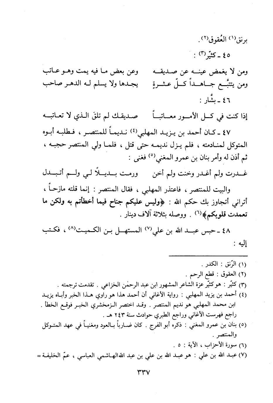 والبيت للمنتصر، فاعتذر المهلبي، فقال المنتصر: إنما قلته مازحا، أتراني أتجاوز بك حكم الله: وَلَيْسَ عَلَيْكُمْ جُناحٌ فِيما أَخْطَأْتُمْ بِهِ وَلكِنْ ما تَعَمَّدَتْ قُلُوبُكُمْ