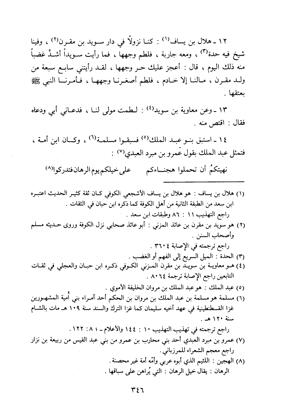12- هلال بن يساف «1» : كنا نزولا في دار سويد بن مقرن «2» ، وفينا شيخ فيه حدة «3» ، ومعه جارية، فلطم وجهها، فما رأيت سويدا أشدّ غضبا منه ذلك اليوم، قال: أعجز عليك حر وجهها، لقد رأيتني سابع سبعة من ولد مقرن، مالنا إلا خادم، فلطم أصغرنا وجهها، فأمرنا النبي صلّى الله عليه وسلّم بعتقها.