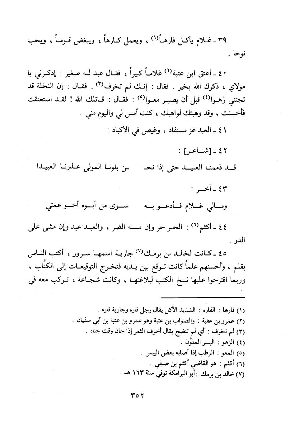 40- أعتق ابن عتبة «2» غلاما كبيرا، فقال عبد له صغير: إذكرني يا مولاي، ذكرك الله بخير. فقال: إنك لم تخرف «3» . فقال: إن النخلة قد تجتني زهوا «4» قبل أن يصير معوا «5» : فقال: قاتلك الله! لقد استعتقت فأحسنت، وقد وهبتك لواهبك، كنت أمس لي واليوم مني.