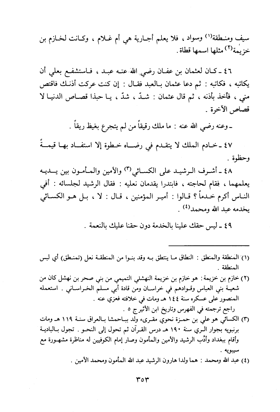 48- أشرف الرشيد على الكسائي «3» والأمين والمأمون بين يديه يعلمهما، فقام لحاجته، فابتدرا يقدمان نعليه: فقال الرشيد لجلسائه: أفي الناس أكرم خدما؟ قالوا: أمير المؤمنين، قال: لا، بل هو الكسائي يخدمه عبد الله ومحمد «4» .