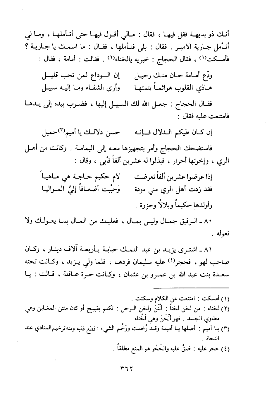 81- اشترى يزيد بن عبد الملك حبابة بأربعة آلاف دينار، وكان صاحب لهو، فحجر «4» عليه سليمان فردها، فلما ولي يزيد، وكانت تحته سعدة بنت عبد الله بن عمرو بن عثمان، وكانت حرة عاقلة، قالت: يا