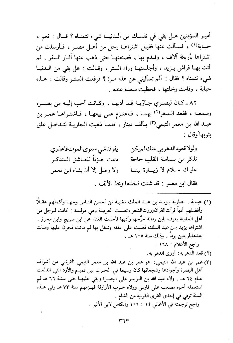 أمير المؤمنين هل بقي في نفسك من الدنيا شيء تتمناه؟ قال: نعم، حبابة «1» ، فسألت عنها فقيل اشتراها رجل من أهل مصر، فأرسلت من اشتراها بأربعة آلاف، وقدم بها، فصنعتها حتى ذهب عنها آثار السفر. ثم أتت بها فراش يزيد، وأجلستها وراء الستر، وقالت: هل بقي من الدنيا شيء تتمناه؟ فقال: ألم تسأليني عن هذا مرة؟ فرفعت الستر وقالت: هذه حبابة، وقامت وخلتها، فحظيت سعدة عنده.