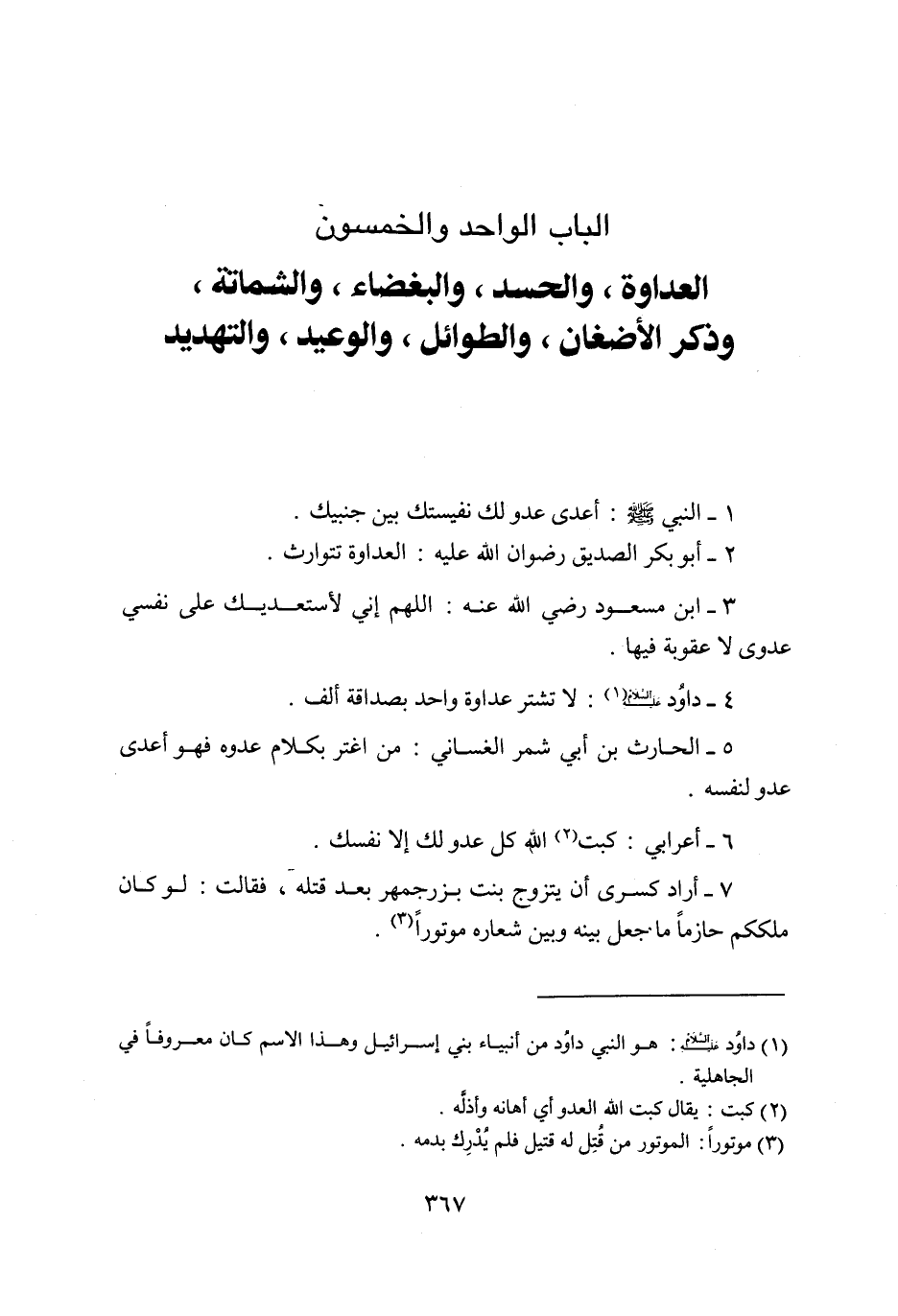 الباب الواحد والخمسون العداوة، والحسد، والبغضاء، والشمانة، وذكر الأضغان، والطوائل، والوعيد، والتهديد