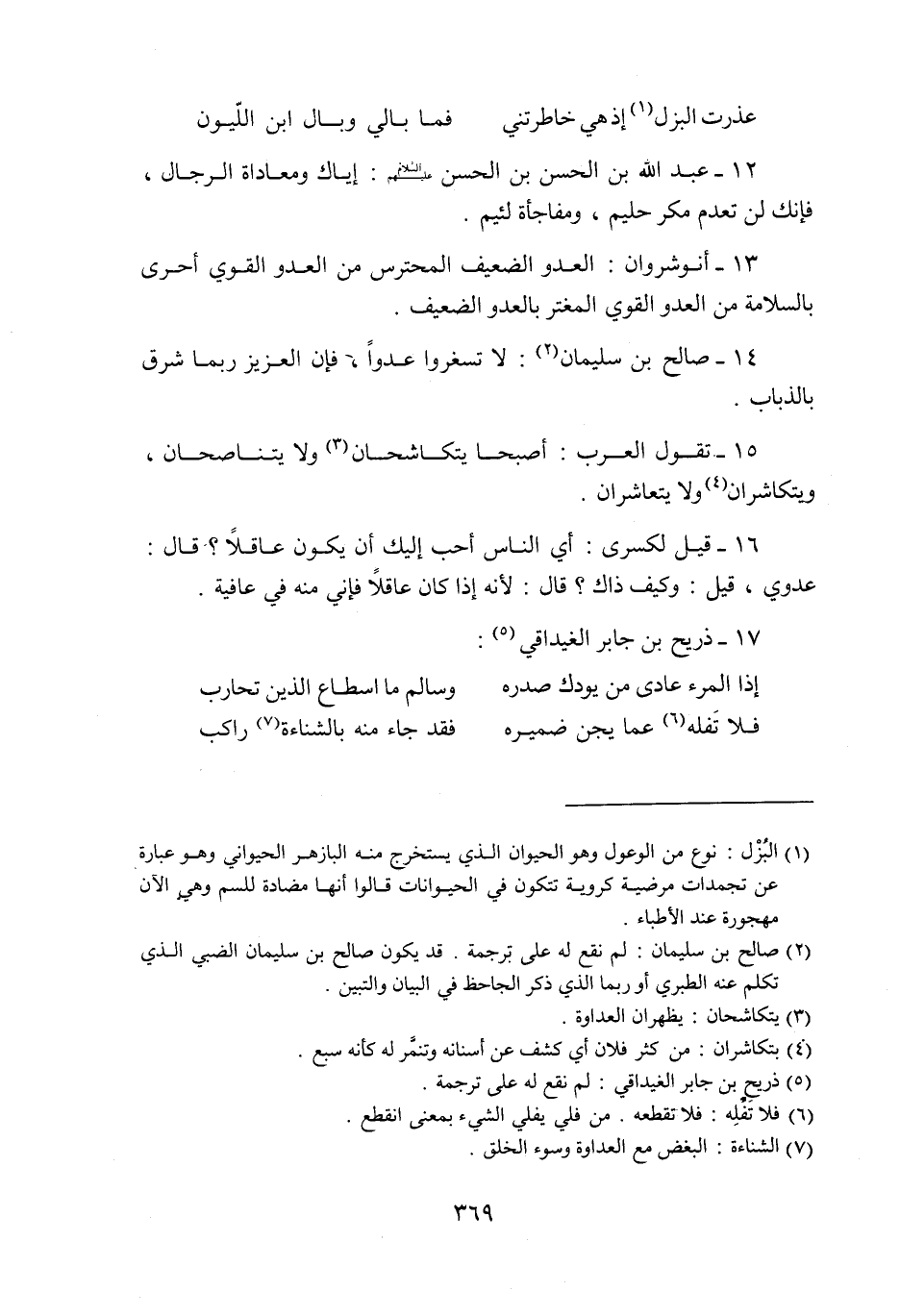 12- عبد الله بن الحسن بن الحسن عليهم السّلام: إياك ومعاداة الرجال، فإنك لن تعدم مكر حليم، ومفاجأة لئيم.
