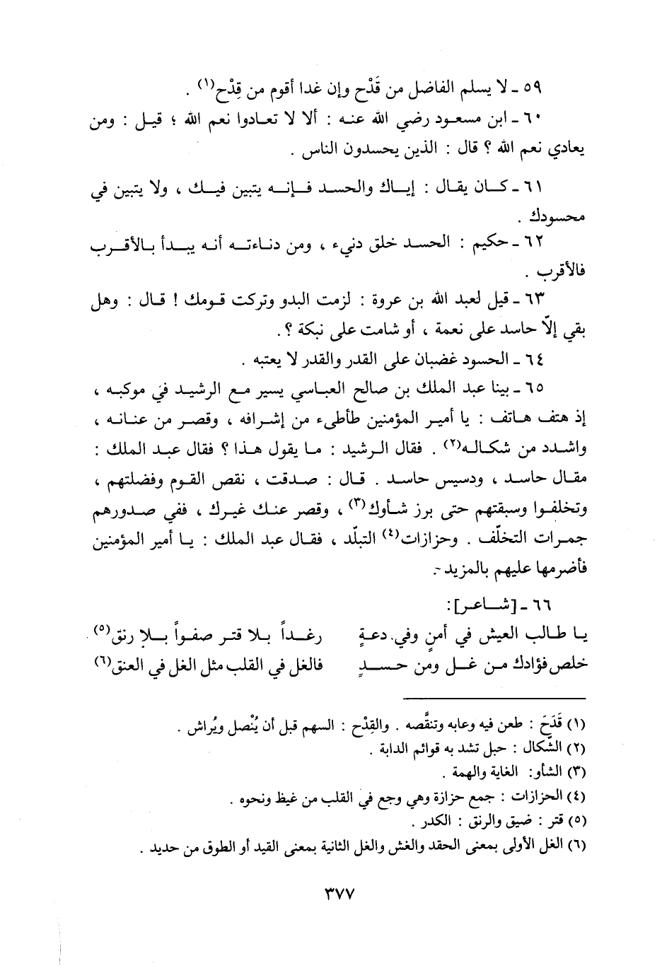 63- قيل لعبد الله بن عروة: لزمت البدو وتركت قومك! قال: وهل بقي إلّا حاسد على نعمة، أو شامت على نبكة؟.