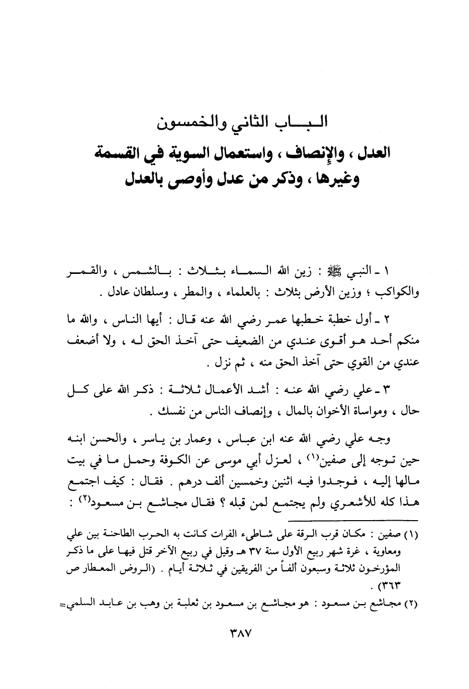 الباب الثاني والخمسون العدل، والإنصاف، واستعمال السوية في القسمة وغيرها، وذكر من عدل وأوصى بالعدل