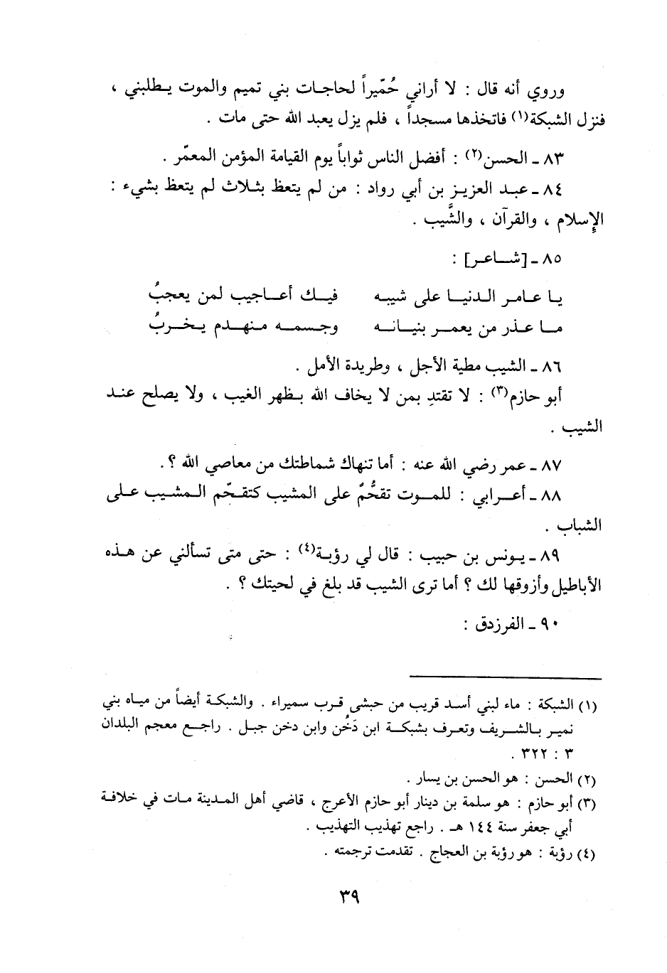 89- يونس بن حبيب: قال لي رؤبة «4» : حتى متى تسألني عن هذه الأباطيل وأزوقها لك؟ أما ترى الشيب قد بلغ في لحيتك؟.