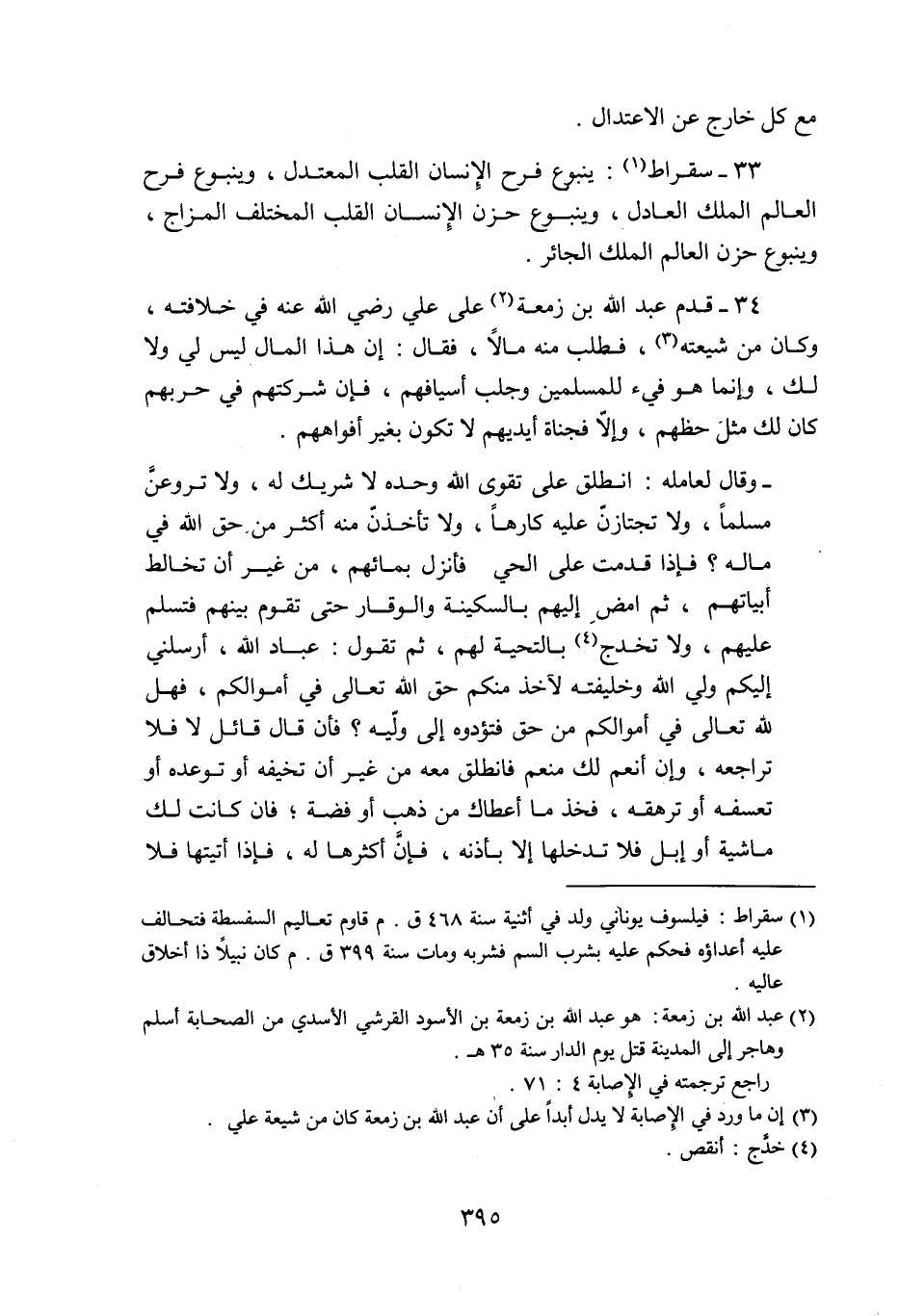 33- سقراط «1» : ينبوع فرح الإنسان القلب المعتدل، وينبوع فرح العالم الملك العادل، وينبوع حزن الإنسان القلب المختلف المزاج، وينبوع حزن العالم الملك الجائر.