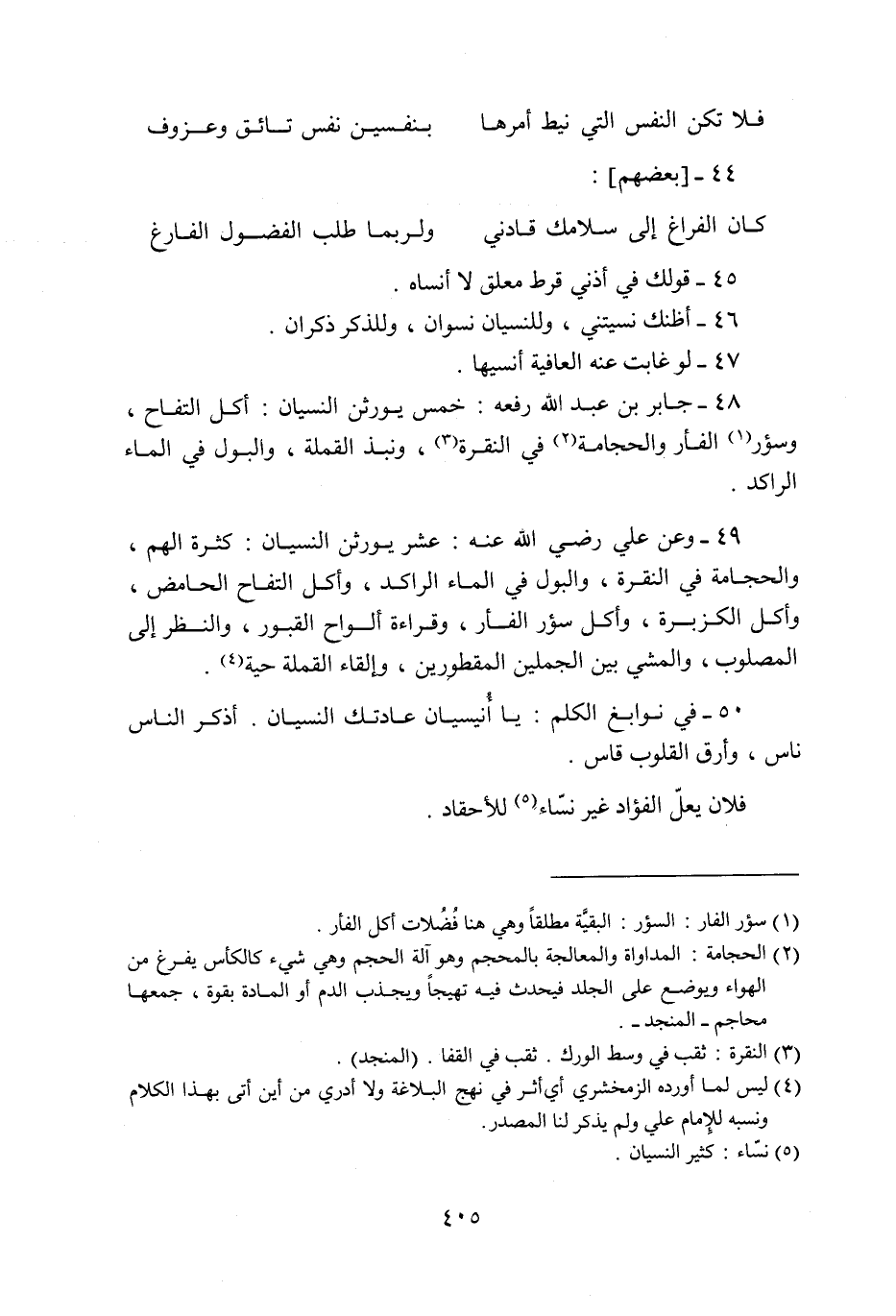 49- وعن علي رضي الله عنه: عشر يورثن النسيان: كثرة الهم، والحجامة في النقرة، والبول في الماء الراكد، وأكل التفاح الحامض، وأكل الكزبرة، وأكل سؤر الفأر، وقراءة ألواح القبور، والنظر إلى المصلوب، والمشي بين الجملين المقطورين، وإلقاء القملة حية «4» .