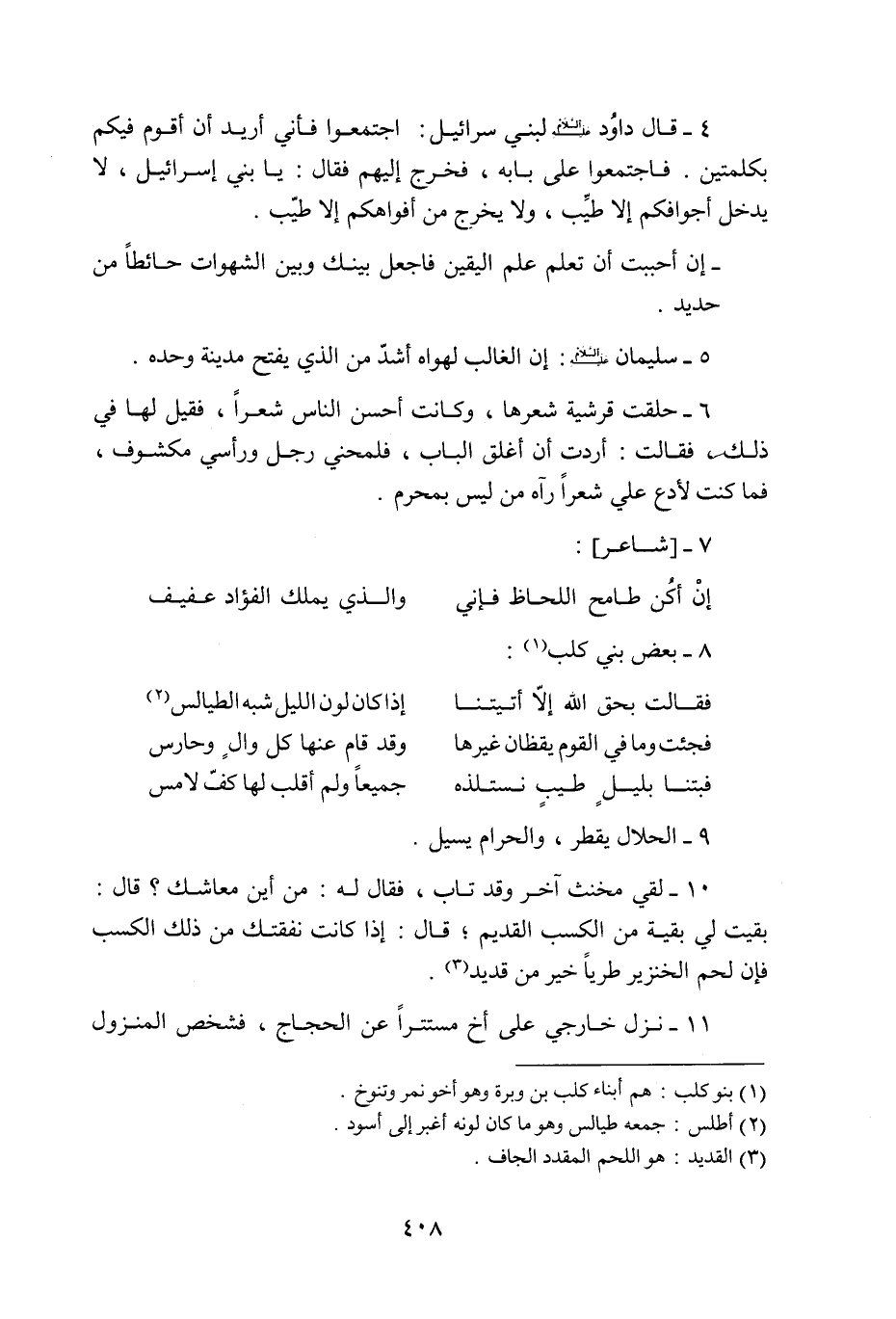 4- قال داود عليه السّلام لبني سرائيل: اجتمعوا فأني أريد أن أقوم فيكم بكلمتين. فاجتمعوا على بابه، فخرج إليهم فقال: يا بني إسرائيل، لا يدخل أجوافكم إلا طيّب، ولا يخرج من أفواهكم إلا طيّب.
