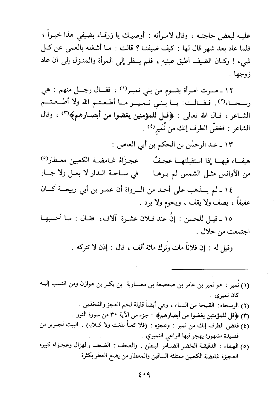 12- مرت امرأة بقوم من بني نمير «1» ، فقال رجل منهم: هي رسحاء «2» . فقالت: يا بني نمير ما أطعتم الله ولا أطعتم الشاعر، قال الله تعالى: قُلْ لِلْمُؤْمِنِينَ يَغُضُّوا مِنْ أَبْصارِهِمْ