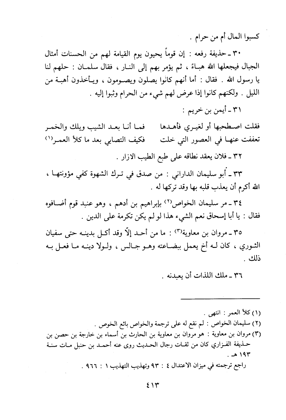 30- حذيفة رفعه: إن قوما يحيون يوم القيامة لهم من الحسنات أمثال الجبال فيجعلها الله هباء، ثم يؤمر بهم إلى النار، فقال سلمان: حلهم لنا يا رسول الله. فقال: أما أنهم كانوا يصلون ويصومون، ويأخذون أهبة من الليل. ولكنهم كانوا إذا عرض لهم شيء من الحرام وثبوا إليه.