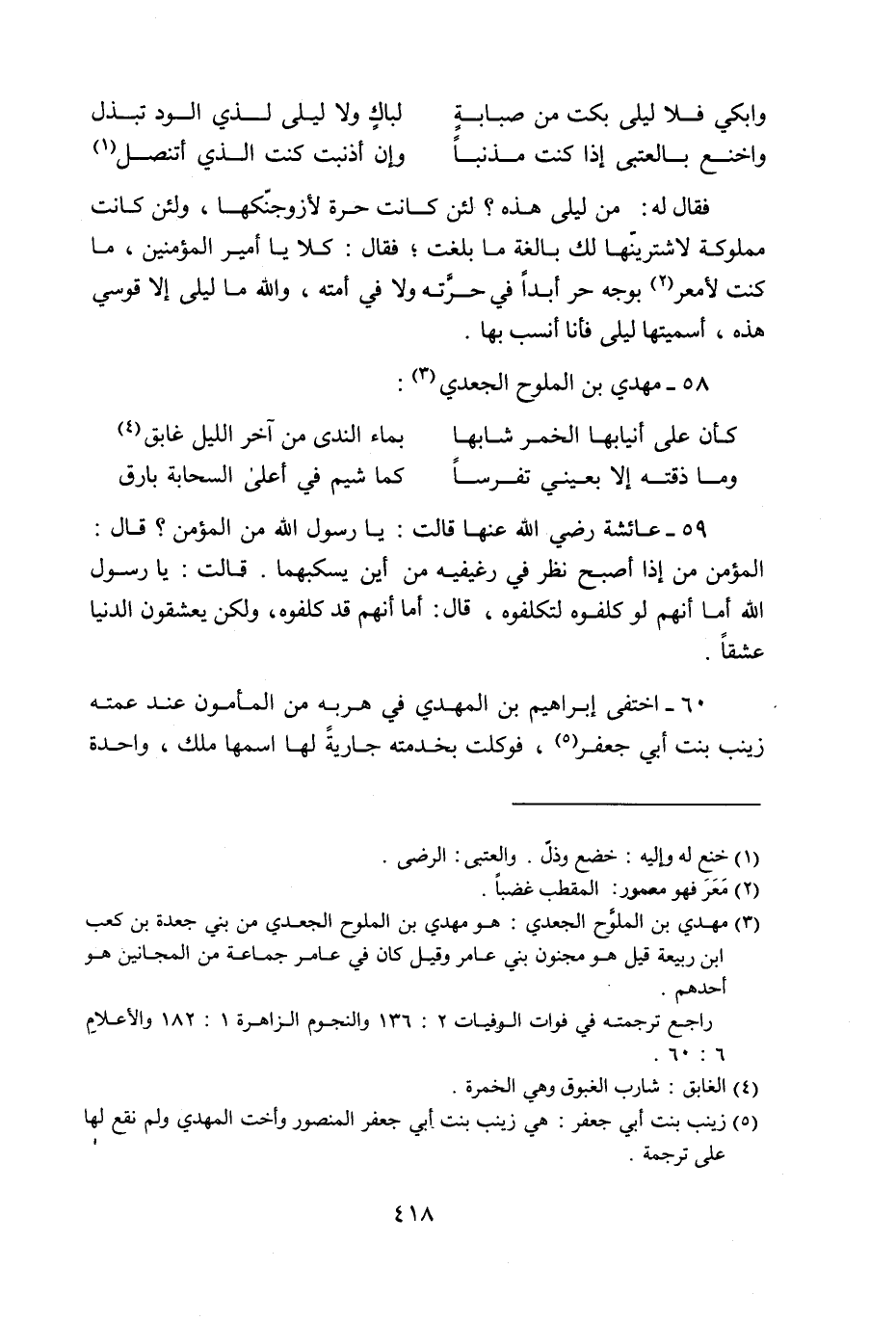 60- اختفى إبراهيم بن المهدي في هربه من المأمون عند عمته زينب بنت أبي جعفر «5» ، فوكلت بخدمته جارية لها اسمها ملك، واحدة