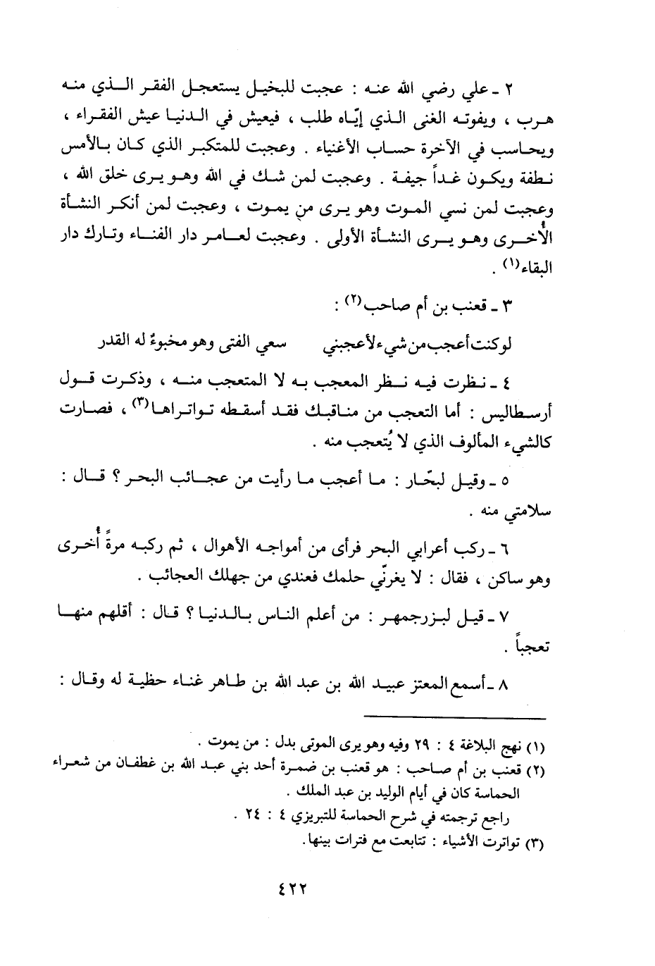 2- علي رضي الله عنه: عجبت للبخيل يستعجل الفقر الذي منه هرب، ويفوته الغنى الذي إيّاه طلب، فيعيش في الدنيا عيش الفقراء، ويحاسب في الآخرة حساب الأغنياء. وعجبت للمتكبر الذي كان بالأمس نطفة ويكون غدا جيفة. وعجبت لمن شك في الله وهو يرى خلق الله، وعجبت لمن نسي الموت وهو يرى من يموت، وعجبت لمن أنكر النشأة الأخرى وهو يرى النشأة الأولى. وعجبت لعامر دار الفناء وتارك دار البقاء «1» .