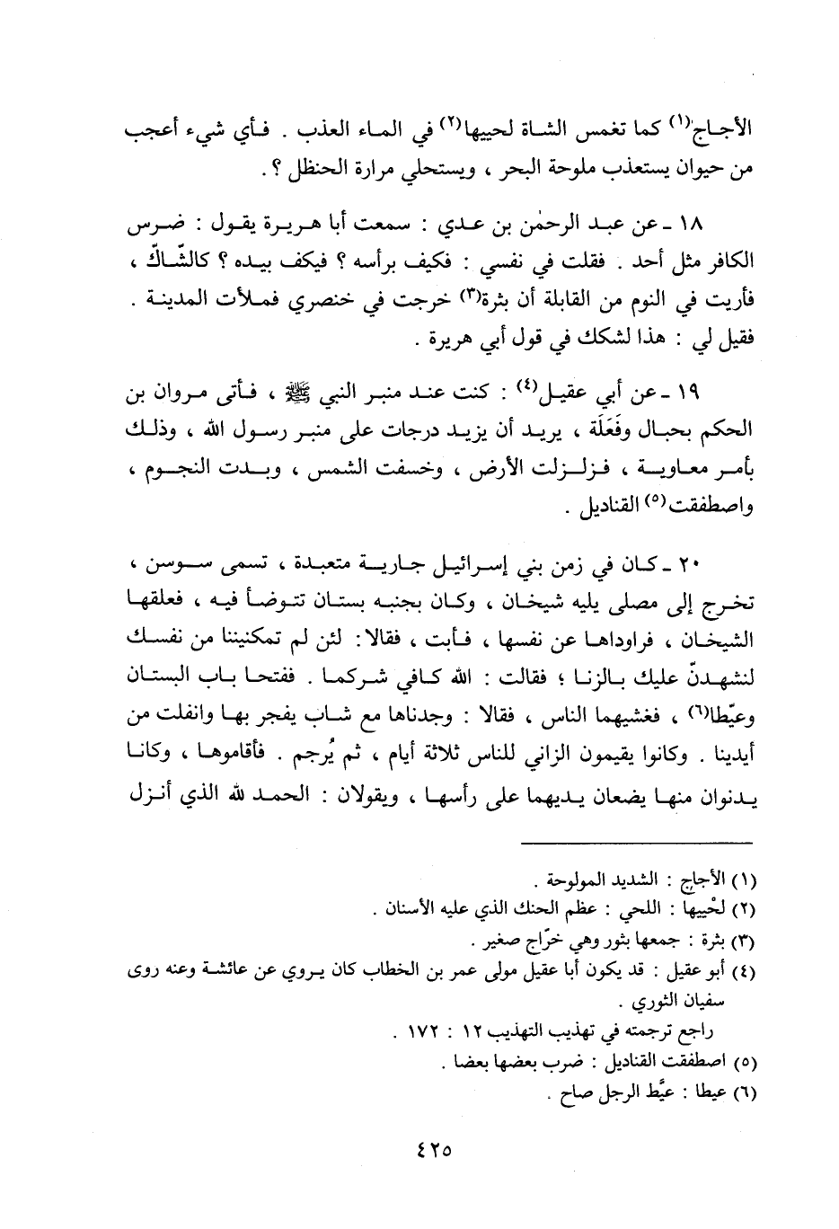 18- عن عبد الرحمن بن عدي: سمعت أبا هريرة يقول: ضرس الكافر مثل أحد. فقلت في نفسي: فكيف برأسه؟ فكيف بيده؟ كالشّاكّ، فأريت في النوم من القابلة أن بثرة «3» خرجت في خنصري فملأت المدينة.