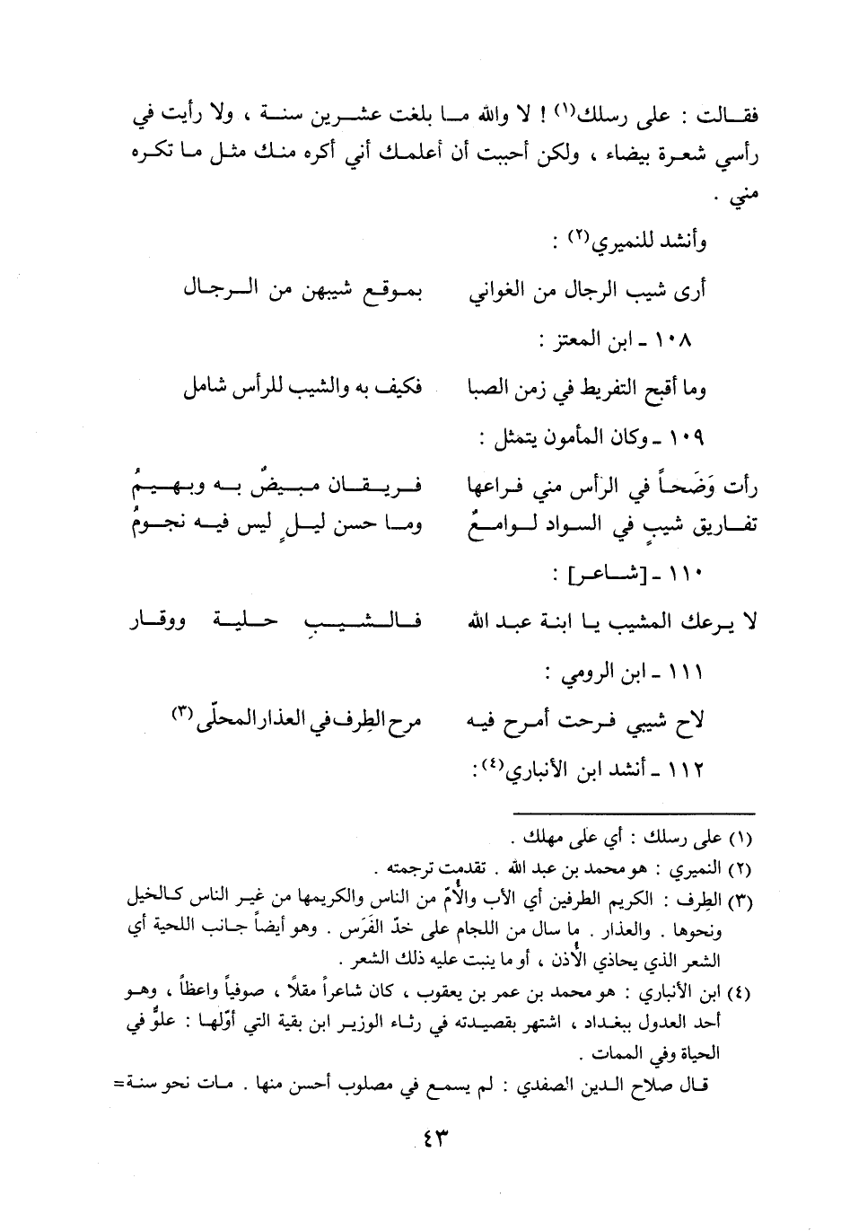 فقالت: على رسلك «1» ! لا والله ما بلغت عشرين سنة، ولا رأيت في رأسي شعرة بيضاء، ولكن أحببت أن أعلمك أني أكره منك مثل ما تكره مني.