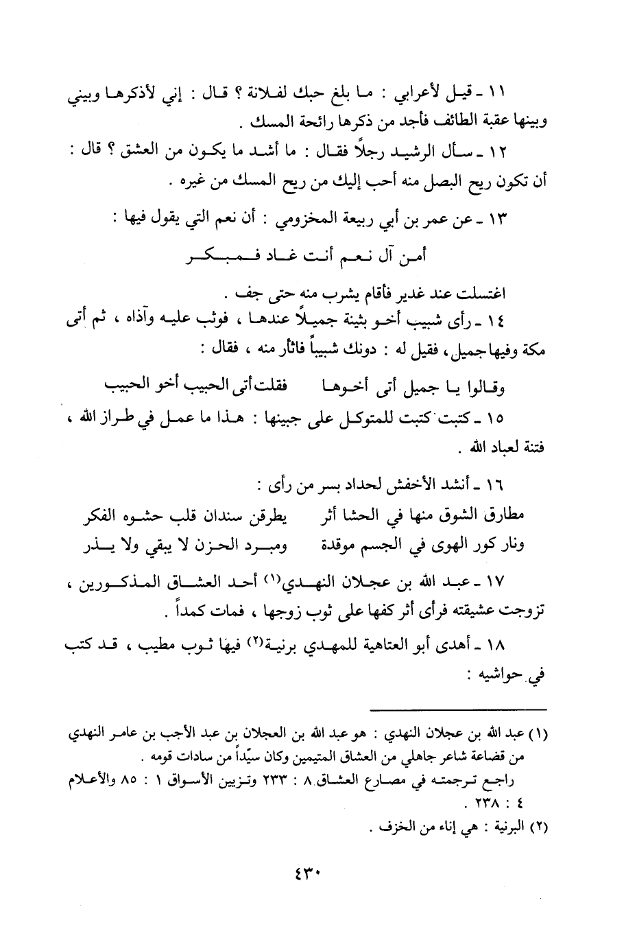 17- عبد الله بن عجلان النهدي «1» أحد العشاق المذكورين، تزوجت عشيقته فرأى أثر كفها على ثوب زوجها، فمات كمدا.