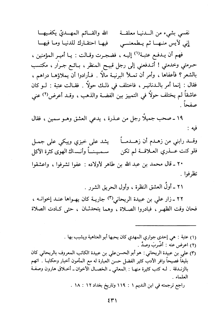 22- زار علي بن عبيدة الريحاني «3» جارية كان يهواها عند إخوانه، فحان وقت الظهر، فبادروا الصلاة، وهما يتحدثان، حتى كادت الصلاة