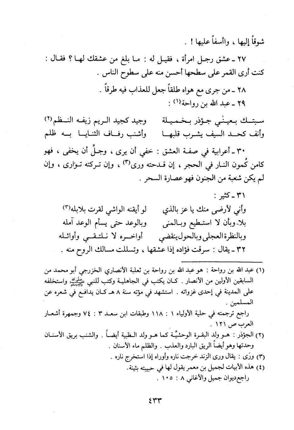 30- أعرابية في صفة العشق: خفي أن يرى، وجلّ أن يخفى، فهو كامن كمون النار في الحجر، إن قدحته ورى «3» ، وإن تركته توارى، وإن لم يكن شعبة من الجنون فهو عصارة السحر.