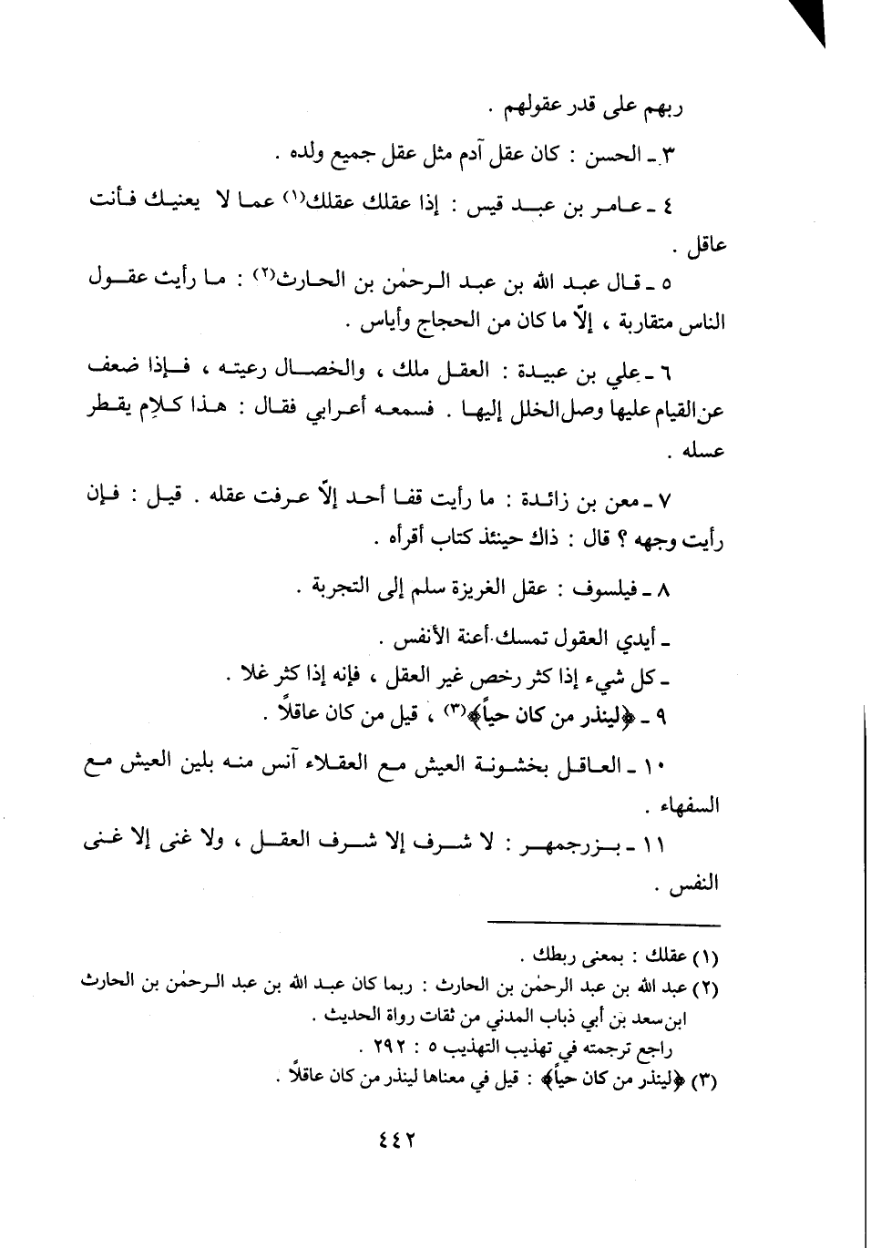 4- عامر بن عبد قيس: إذا عقلك عقلك «1» عما لا يعنيك فأنت عاقل.
