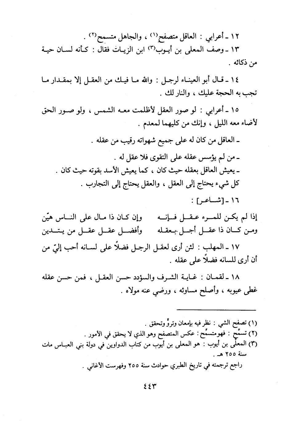 15- أعرابي: لو صور العقل لأظلمت معه الشمس، ولو صور الحق لأضاء معه الليل، وإنك من كليهما لمعدم.