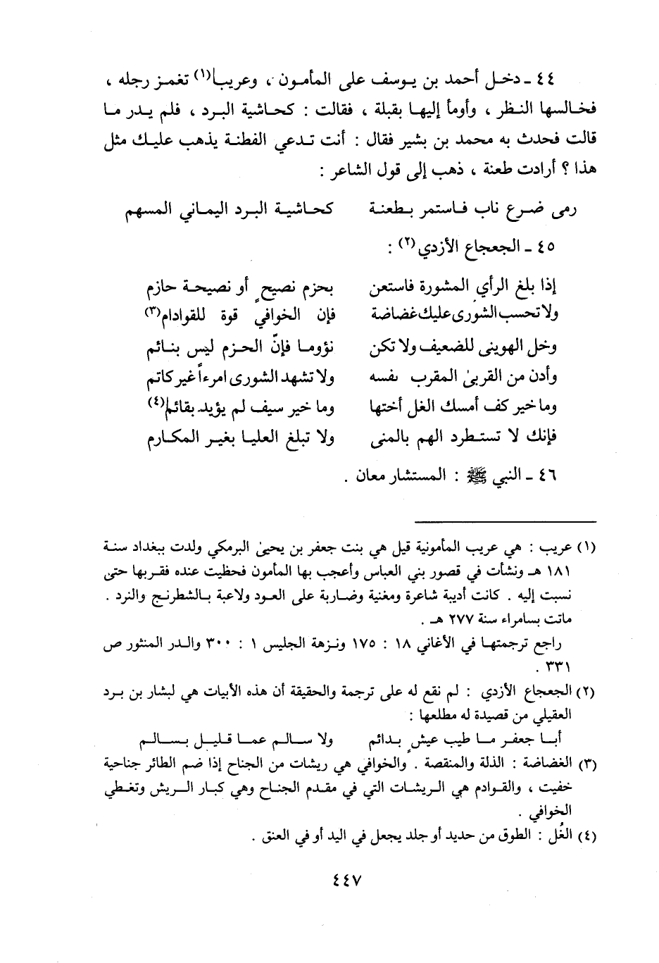 44- دخل أحمد بن يوسف على المأمون، وعريبا «1» تغمز رجله، فخالسها النظر، وأومأ إليها بقبلة، فقالت: كحاشية البرد، فلم يدر ما قالت فحدث به محمد بن بشير فقال: أنت تدعي الفطنة يذهب عليك مثل هذا؟ أرادت طعنة، ذهب إلى قول الشاعر: