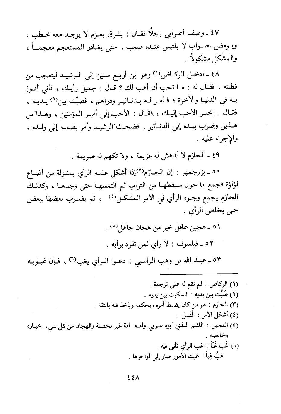 47- وصف أعرابي رجلا فقال: يشرق بعزم لا يوجد معه خطب، ويومض بصواب لا يلتبس عنده صعب، حتى يغادر المستعجم معجما، والمشكل مشكولا.