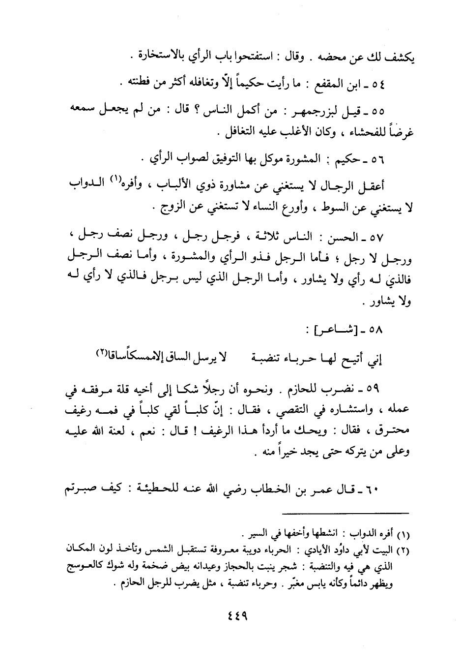 57- الحسن: الناس ثلاثة، فرجل رجل، ورجل نصف رجل، ورجل لا رجل، فأما الرجل فذو الرأي، والمشورة، وأما نصف الرجل فالذي له رأي، ولا يشاور، وأما الرجل الذي ليس برجل فالذي لا رأي له ولا يشاور.