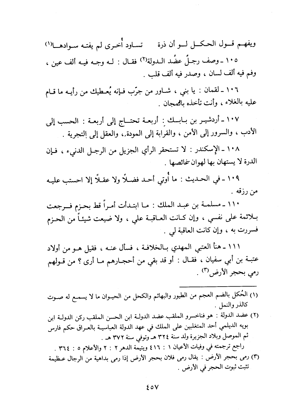 107- أردشير بن بابك: أربعة تحتاج إلى أربعة: الحسب إلى الأدب، والسرور إلى الأمن، والقرابة إلى المودة، والعقل إلى التجرية.