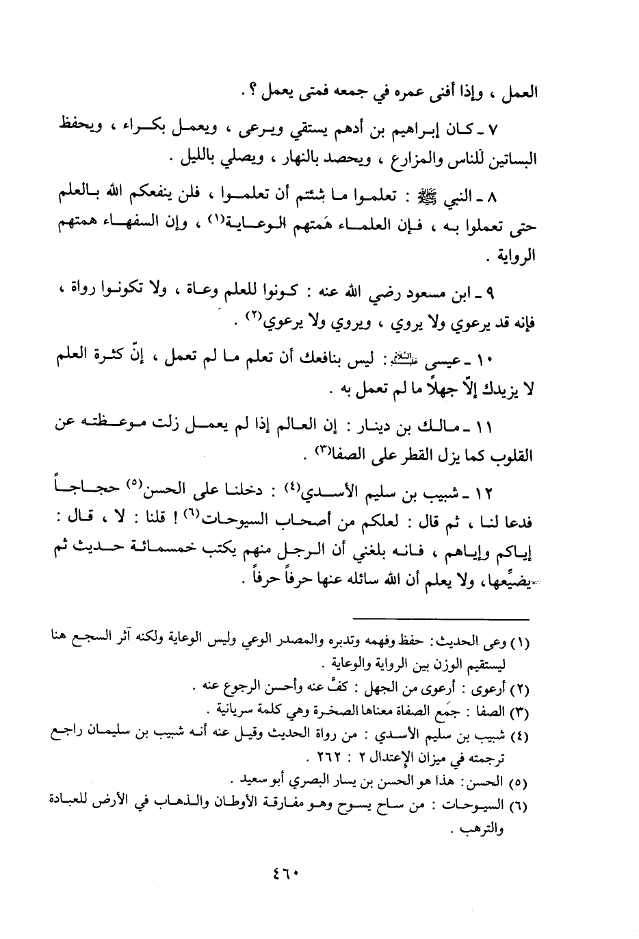 8- النبي صلّى الله عليه وسلّم: تعلموا ما شئتم أن تعلموا، فلن ينفعكم الله بالعلم حتى تعملوا به، فإن العلماء همتهم الوعاية «1» ، وإن السفهاء همتهم الرواية.