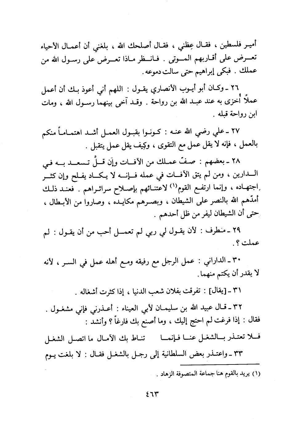 30- الداراني: عمل الرجل مع رفيقه ومع أهله عمل في السر، لأنه لا يقدر أن يكتم منهما.