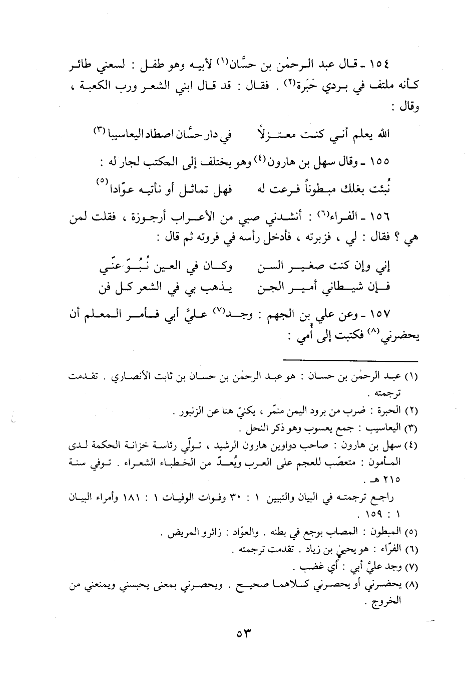 154- قال عبد الرحمن بن حسّان «1» لأبيه وهو طفل: لسعني طائر كأنه ملتف في بردي حبرة «2» . فقال: قد قال ابني الشعر ورب الكعبة، وقال: