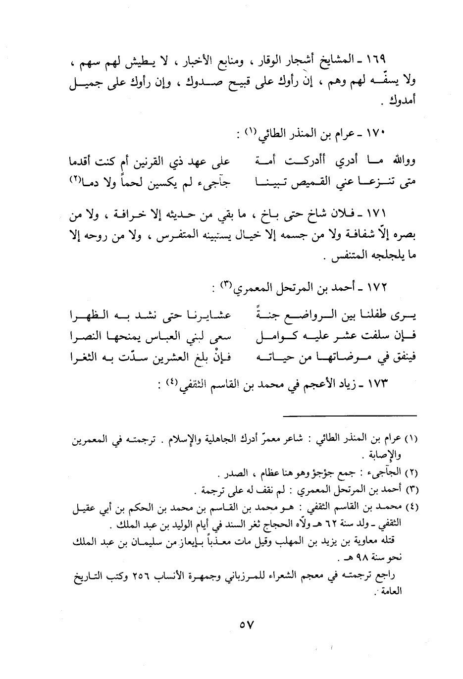 169- المشايخ أشجار الوقار، ومنابع الأخبار، لا يطيش لهم سهم، ولا يسفّه لهم وهم، إن رأوك على قبيح صدوك، وإن رأوك على جميل أمدوك.