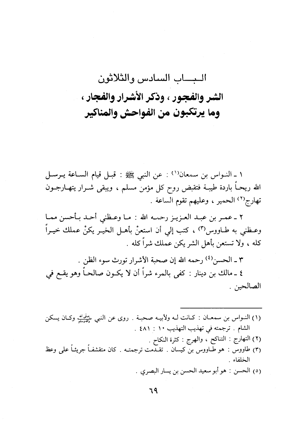 1- النواس بن سمعان «1» : عن النبي صلّى الله عليه وسلّم: قبل قيام الساعة يرسل الله ريحا باردة طيبة فتقبض روح كل مؤمن مسلم، ويبقى شرار يتهارجون تهارج «2» الحمير، وعليهم تقوم الساعة.