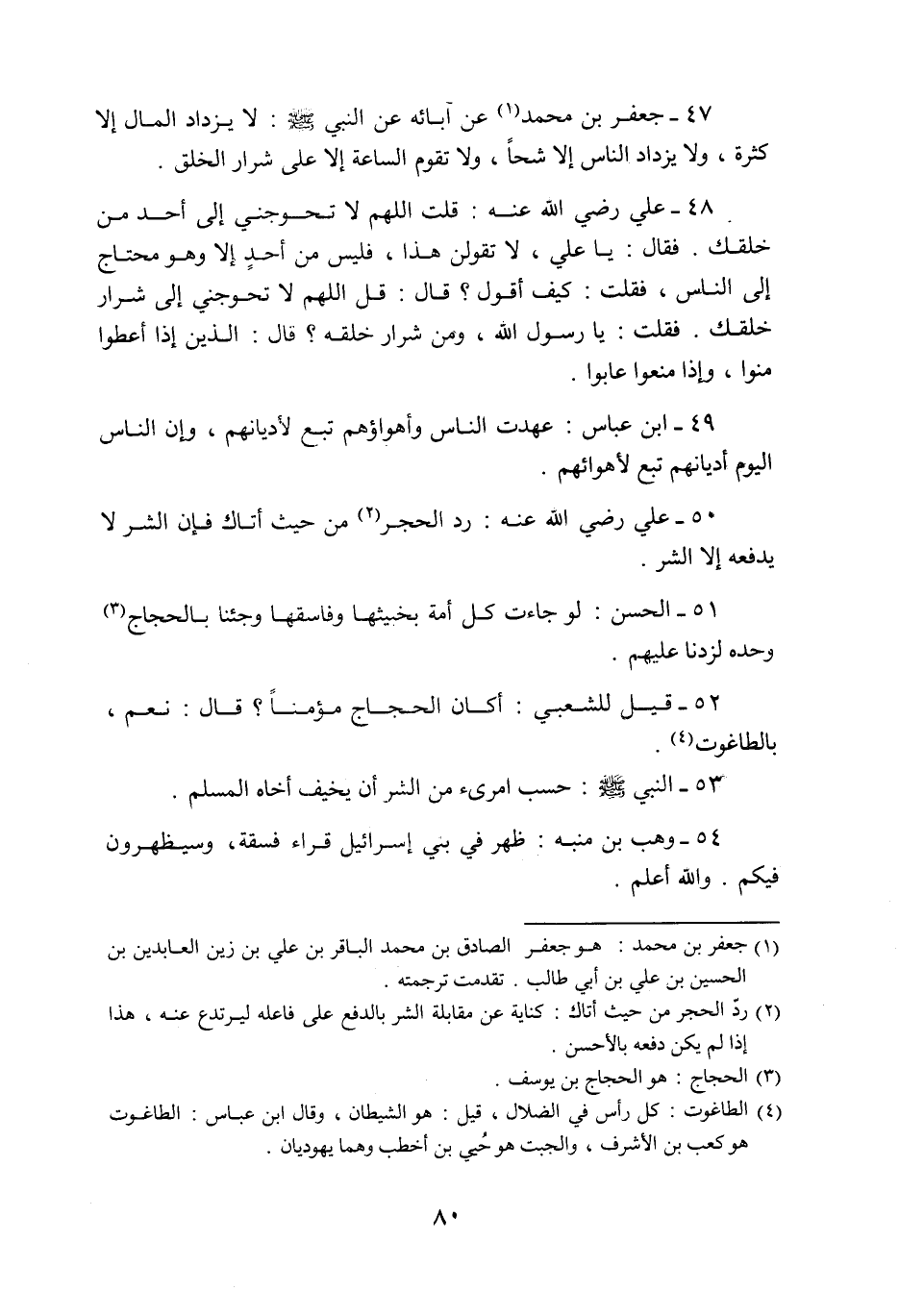 47- جعفر بن محمد «1» عن آبائه عن النبي صلّى الله عليه وسلّم: لا يزداد المال إلا كثرة، ولا يزداد الناس إلا شحا، ولا تقوم الساعة إلا على شرار الخلق.