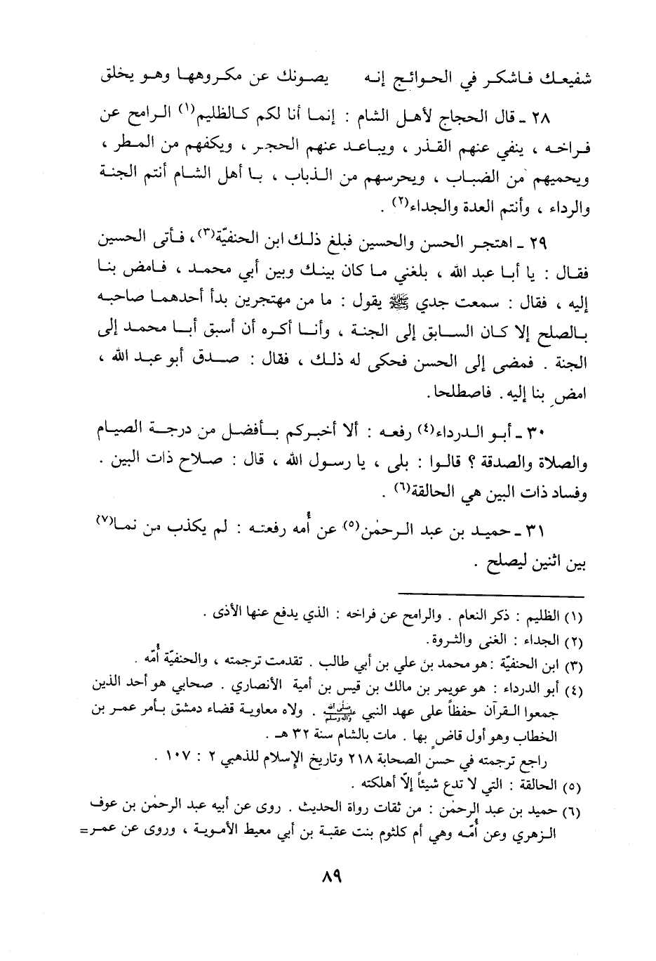 29- اهتجر الحسن والحسين فبلغ ذلك ابن الحنفيّة «3» ، فأتى الحسين فقال: يا أبا عبد الله، بلغني ما كان بينك وبين أبي محمد، فامض بنا إليه، فقال: سمعت جدي صلّى الله عليه وسلّم يقول: ما من مهتجرين بدأ أحدهما صاحبه بالصلح إلا كان السابق إلى الجنة، وأنا أكره أن أسبق أبا محمد إلى الجنة. فمضى إلى الحسن فحكى له ذلك، فقال: صدق أبو عبد الله، امض بنا إليه. فاصطلحا.