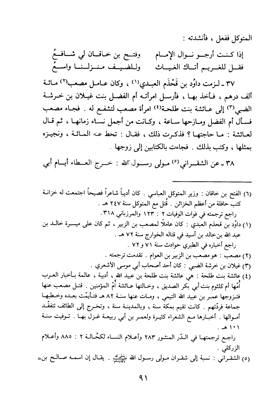37- لزمت داود بن قحذم العبدي «1» ، وكان عامل مصعب «2» مائة ألف درهم، فأخذ بها، فأرسل امرأته أم الفضل بنت غيلان بن خرشة الضبي «3» إلى عائشة بنت طلحة «4» امرأة مصعب لتشفع له. فجاء مصعب فسأل أم الفضل ومازحها ساعة، وكانت من أجمل نساء زمانها، ثم قال لعائشة: ما حاجتها؟ فذكرت ذلك، فقال: تحط عنه المائة، ونجيزه بمثلها، وكتب بذلك. فجاءت بالكتابين إلى زوجها.