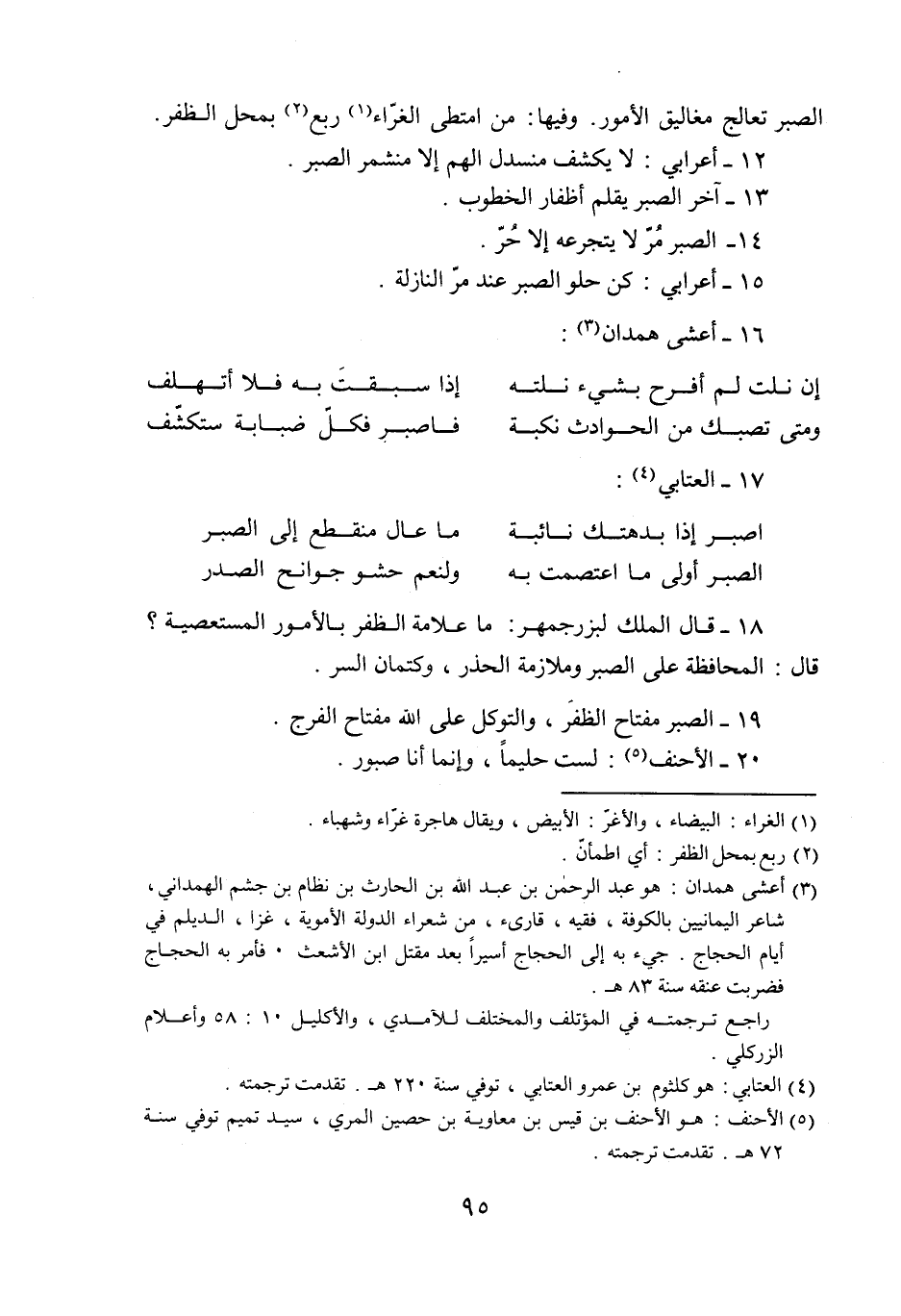 الصبر تعالج مغاليق الأمور. وفيها: من امتطى الغرّاء «1» ربع «2» بمحل الظفر.