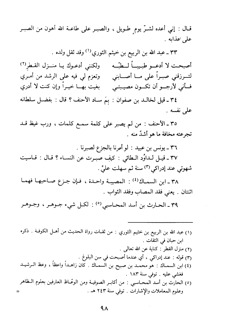 37- قيل لداود الطائي: كيف صبرت عن النساء؟ قال: قاسيت شهوتي عند إدراكي «3» سنة ثم سهلت عليّ.