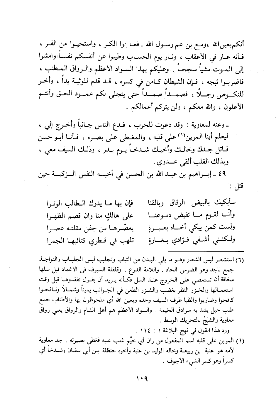 أنكم بعين الله، ومع ابن عم رسول الله. فعابوا الكر، واستحيوا من الفر، فأنه عار في الأعقاب، ونار يوم الحساب وطيبوا عن أنفسكم نفسا وامشوا إلى الموت مشيا سجحا. وعليكم بهذا السواد الأعظم والرواق المطنب، فاضربوا ثبجه، فإن الشيطان كامن في كسره، قد قدم للوثبة يدا، وأخر للنكوص رجلا، فصمدا صمدا حتى يتجلى لكم عمود الحق وأنتم الأعلون، والله معكم، ولن يتركم أعمالكم.