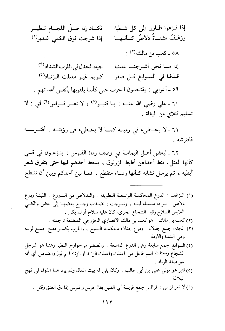 60- علي رضي الله عنه: يا قنبر «5» ، لا تعر فراس «6» أي: لا تسليم قتلاي من البغاة.