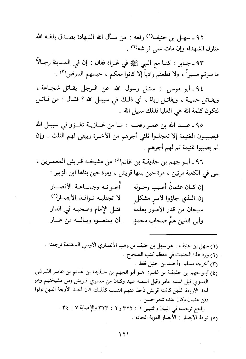 92- سهل بن حنيف «1» رفعه: من سأل الله الشهادة بصدق بلغه الله منازل الشهداء وإن مات على فراشه «2» .
