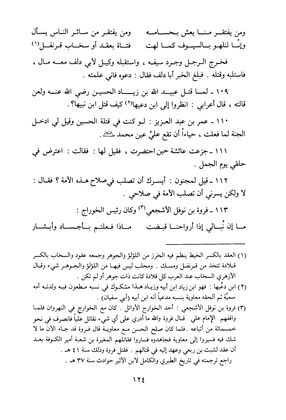 109- لما قتل عبيد الله بن زياد الحسين رضي الله عنه ولعن قالته، قال أعرابي: انظروا إلى ابن دعيها «2» كيف قتل ابن نبيها؟.