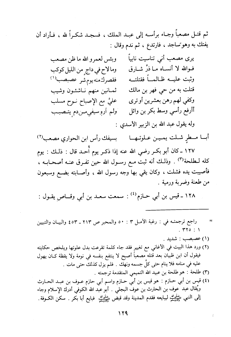 127- كان أبو بكر رضي الله عنه إذا ذكر يوم أحد قال: ذلك: يوم كله لطلحة «3» . وذلك أنه ثبت مع رسول الله حين تفرق عنه أصحابه، فأصيبت يده فشلت، وكان يقي بها وجه رسول الله، وأصابته بضع وسبعون من طعنة وضربة ورمية.
