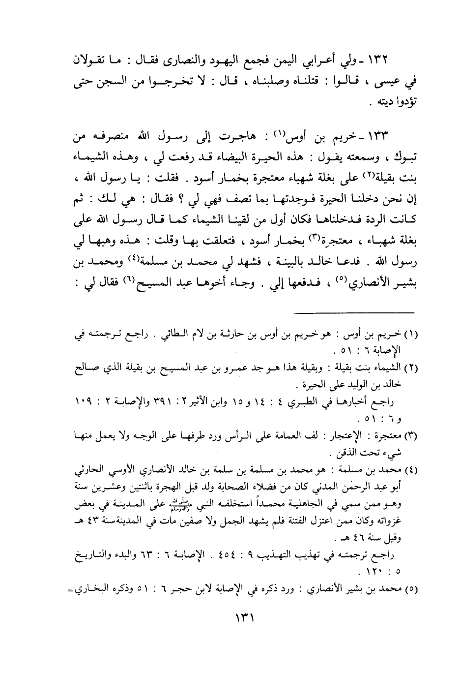 133- خريم بن أوس «1» : هاجرت إلى رسول الله منصرفه من تبوك، وسمعته يقول: هذه الحيرة البيضاء قد رفعت لي، وهذه الشيماء بنت بقيلة «2» على بغلة شهباء معتجرة بخمار أسود. فقلت: يا رسول الله، إن نحن دخلنا الحيرة فوجدتها بما تصف فهي لي؟ فقال: هي لك: ثم كانت الردة فدخلناها فكان أول من لقينا الشيماء كما قال رسول الله على بغلة شهباء، معتجرة «3» بخمار أسود، فتعلقت بها وقلت: هذه وهبها لي رسول الله. فدعا خالد بالبينة، فشهد لي محمد بن مسلمة «4» ومحمد بن بشير الأنصاري «5» ، فدفعها إلي. وجاء أخوها عبد المسيح «6» فقال لي: