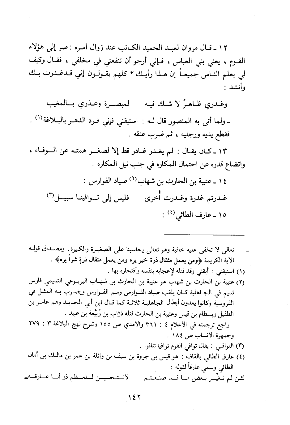 12- قال مروان لعبد الحميد الكاتب عند زوال أمره: صر إلى هؤلاء القوم، يعني بني العباس، فإني أرجو أن تنفعني في مخلفي، فقال وكيف لي بعلم الناس جميعا إن هذا رأيك؟ كلهم يقولون إني قد غدرت بك وأنشد: