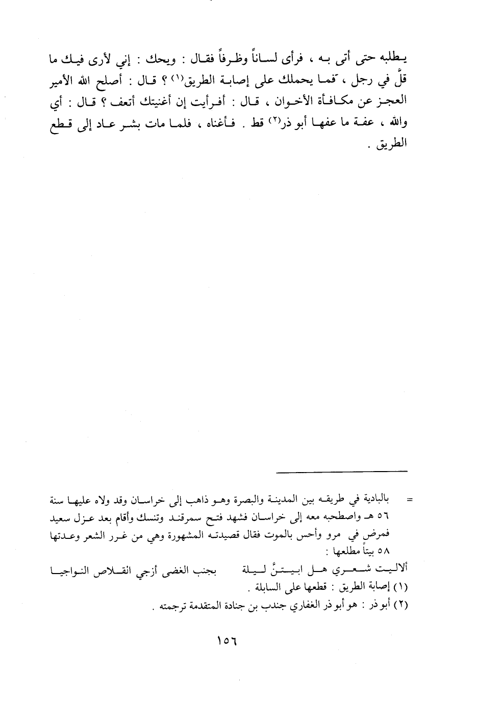 يطلبه حتى أتى به، فرأى لسانا وظرفا فقال: ويحك: إني لأرى فيك ما قلّ في رجل، فما يحملك على إصابة الطريق «1» ؟ قال: أصلح الله الأمير العجز عن مكافأة الأخوان، قال: أفرأيت إن أغنيتك أتعف؟ قال: أي والله، عفة ما عفها أبو ذر «2» قط. فأغناه، فلما مات بشر عاد إلى قطع الطريق.